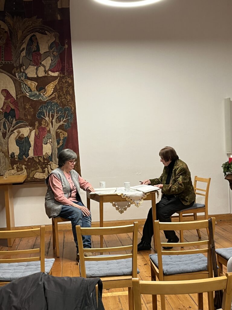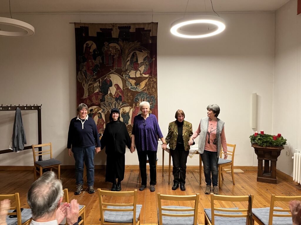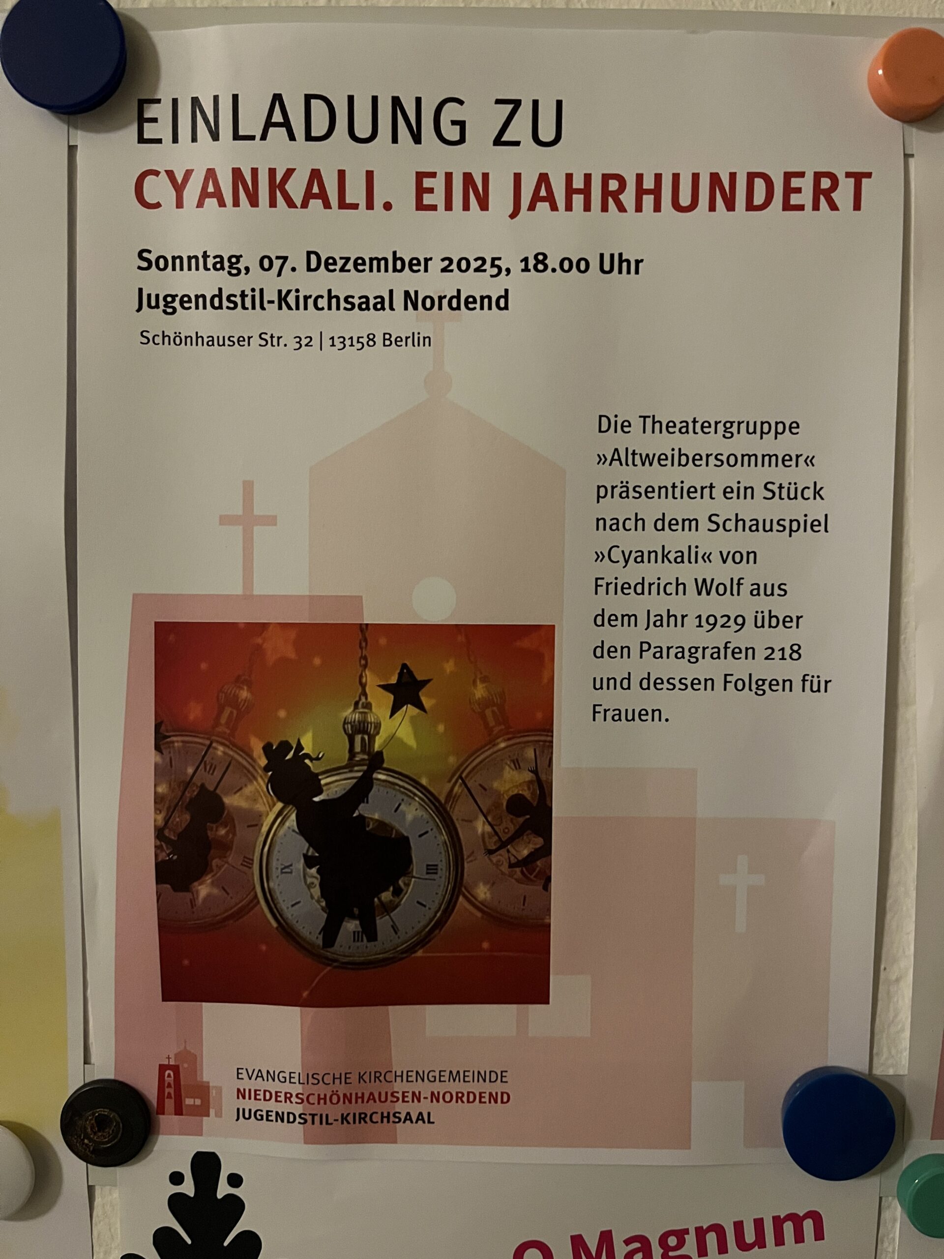 Zum 7. Türchen waren wir im Gemeindehaus Nordend zu Gast und die Theatergruppe Altweibersommer zeigte ihre Interpretation vom Stück „Cyankali. Ein Jahrhundert“ von Friedrich Wolf, das seinerzeit 1929/30 das erfolgreichste Schauspiel in Deutschland war und auch weltweit zur Aufführung kam. Handlung ist der Paragraf 218 und die Auswirkung auf die Frauen. Ein starkes Thema eindrucksvoll gespielt von den fünf Frauen der Theatergruppe.