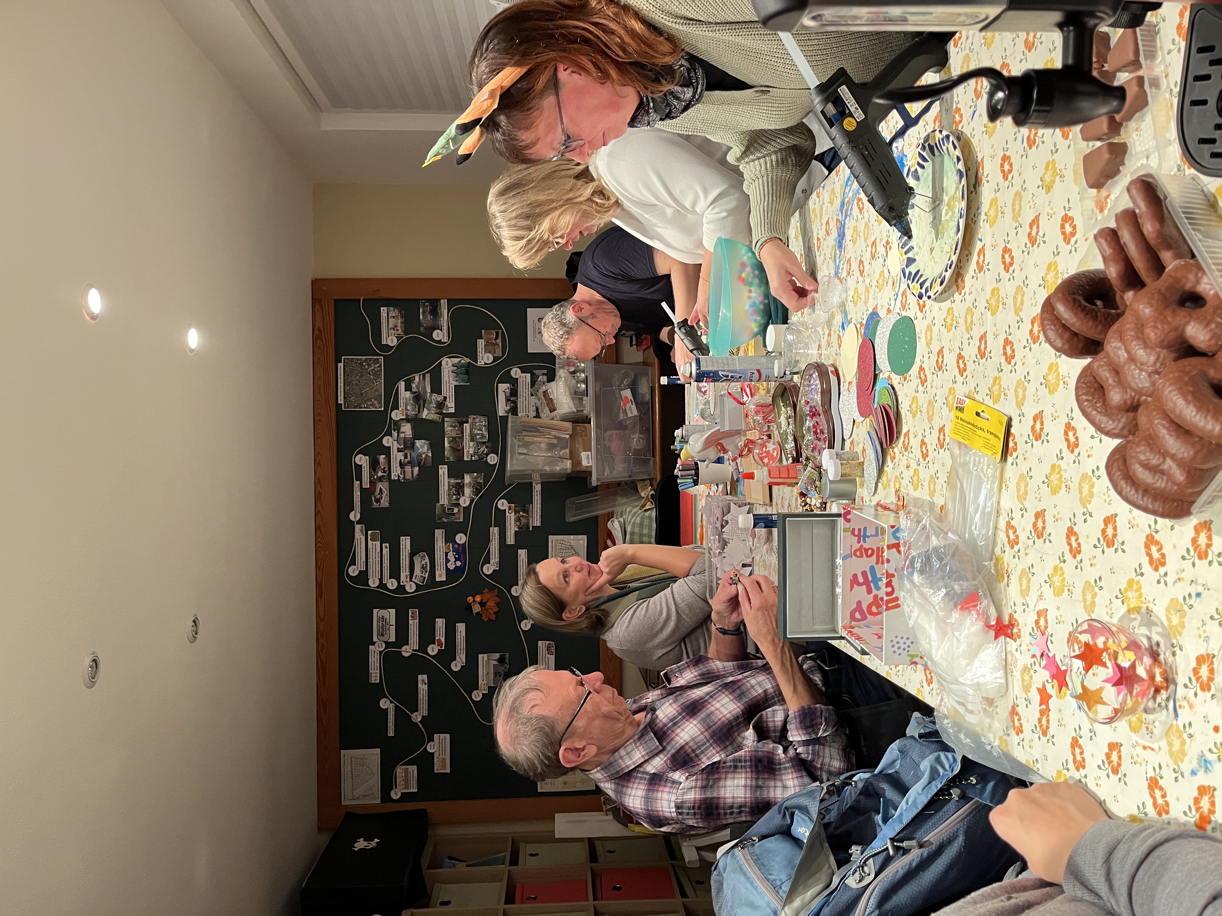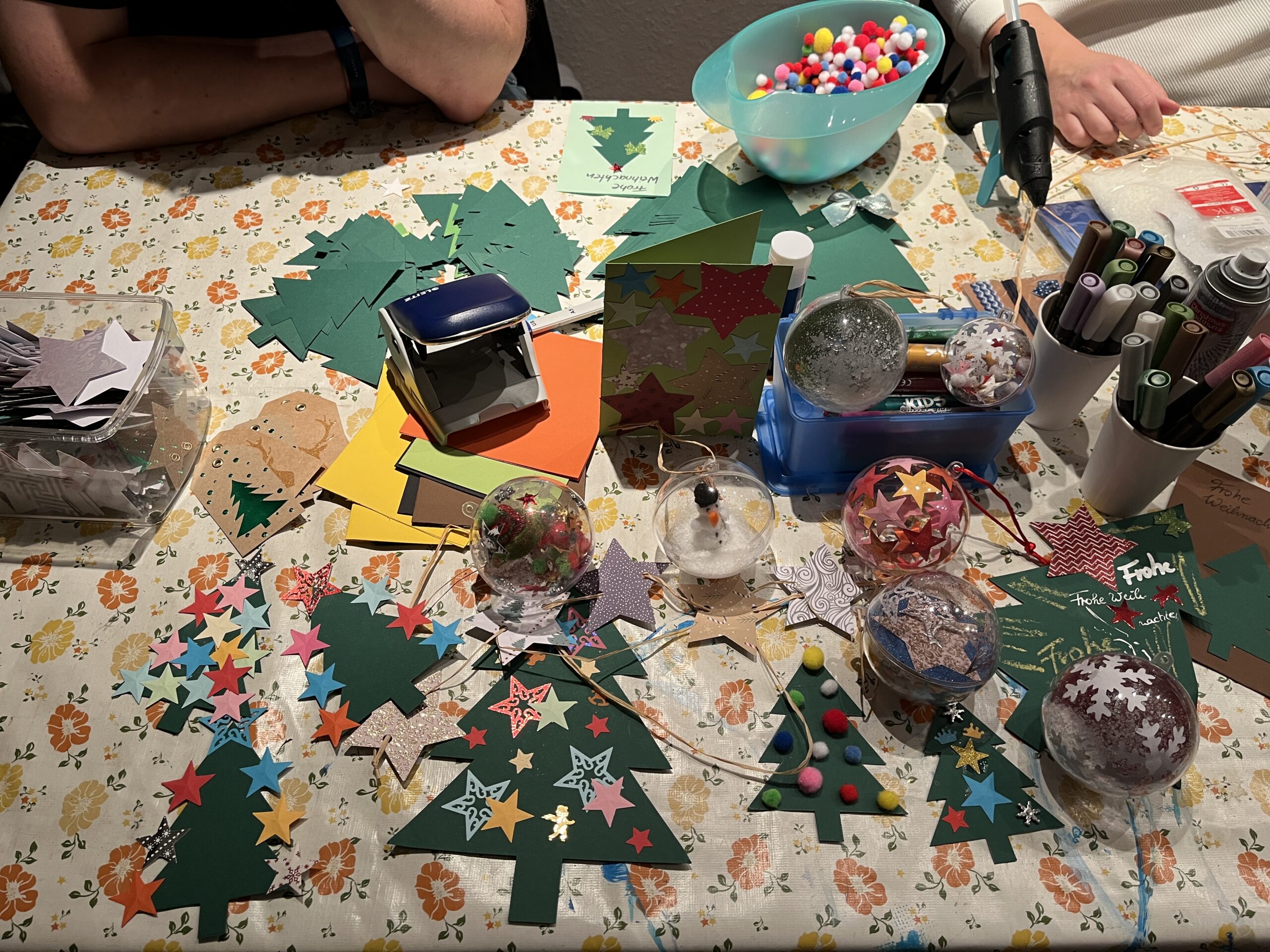 Draußen war es trüb und feucht, doch als wir dann an die richtige Tür klopften öffnete sich hell und warm ein wahres Bastelparadies. Drei Frauen des Vereins empfingen uns sehr herzlich und wir konnten ganz entspannt beim Plaudern Kugeln, Karten und weihnachtliche Deko gestalten.