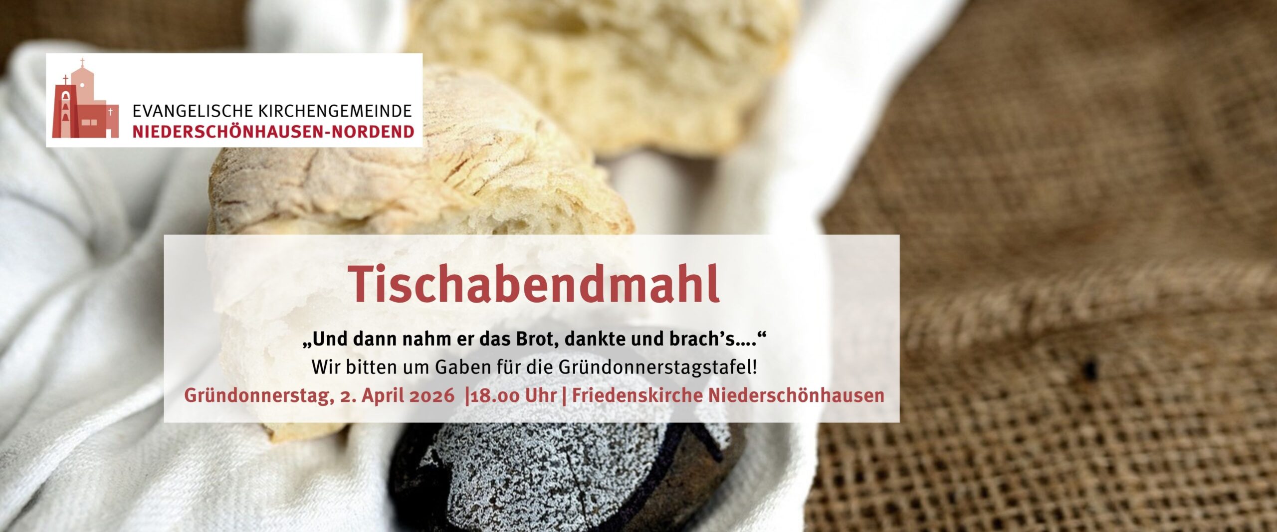 Wir laden am Gründonnerstag, 2. April 2026 unter dem Titel „Und dann nahm er das Brot, dankte und brach’s…“ zum Tischabendmahl ein.